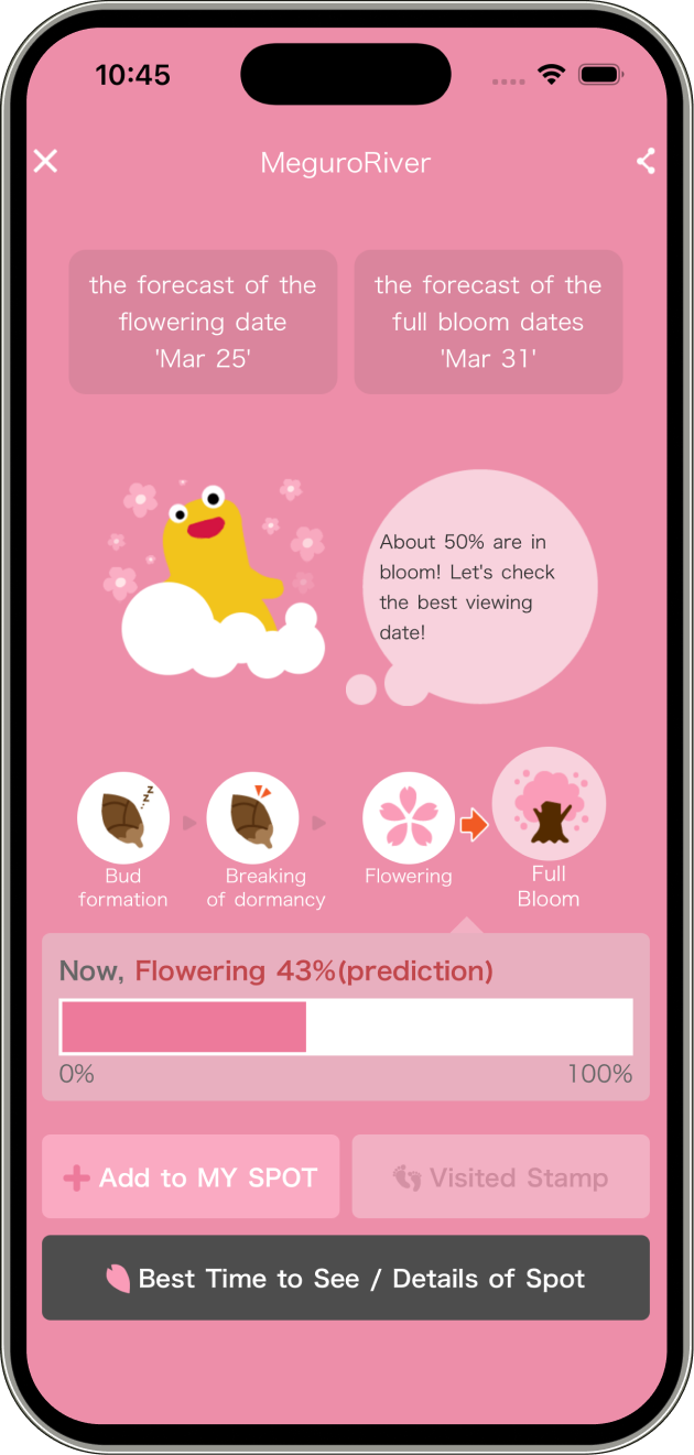 This is an app where you can find out information on the forecast of the flowering and full bloom dates of the cherry blossoms and their progress towards flowering (Flowering Meter) all over Japan.